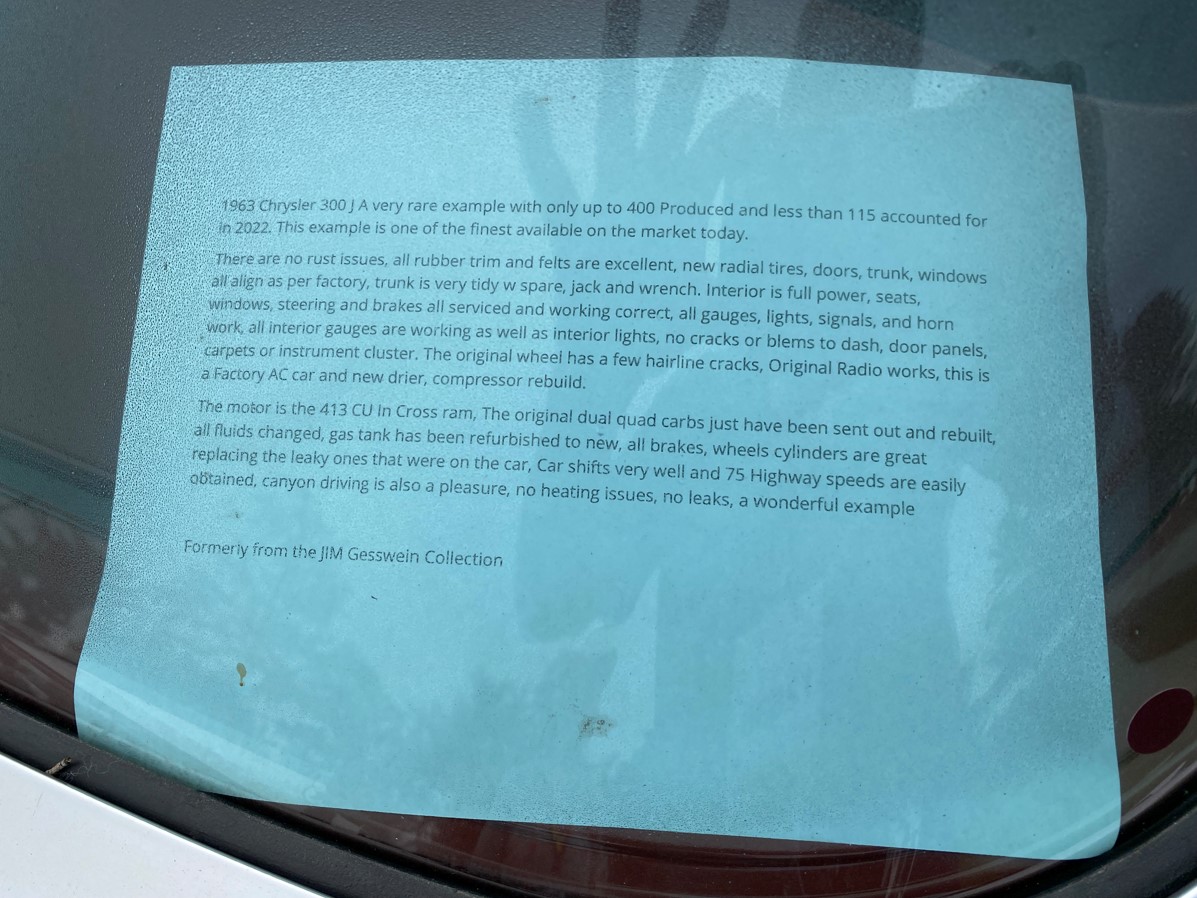 FYI, the ad doesn’t show the undercarriage on this J, but I have photos in my file on the car from the recent Monterrey auction (see below). The undercarriage appears clean, but mostly unrestored. New gas tank is evident. Carl From: Carl I can provide some more recent history on this car. Following Lusvardi’s ownership, the car was owned by Jim Gesswein in SD (a dealer) and sold to an unknown party around 2011. The car resurfaced in Sept. 2022 and was sold to Aaron Ruskin of CA at auction on 9/23/22 for $33850. Ruskin contacted me at that time requesting my advice on its value. He ignored my advice and had the car for sale for many months at the unrealistic price of approx.. $69,000. The car was consigned to the recent Mecum Monterrey auction where it was a no sale with a high bid of $35,000. Former club member Gary Burger was on site and examined the car, reporting to me that it essentially looked better in photos than in person, and was not in a condition to justify the high bid in his opinion. Whether or not the car subsequently sold at Mecum as a “bid goes on” in unknown, but it now appears for sale as indicated below. Mark is correct that it is a color change from factory Alabaster. The interior is Goers leather from some years ago and is not a match to factory, or even very close. The carpet should be Tuxedo Red and not black. The tach is aftermarket. On the positive side, engine compt. looks correct and the car is in nice shape overall but not show quality. Running/driving condition unknown. Carl B. J guy From: mplindahl@xxxxxxxxxxxxx Old 300 Club record from 2002 shows this 300J was owned by Reuben Lusvardi and the original color was Alabster. From: 'James Douglas' via Chrysler 300 Club International <chrysler-300-club-international@xxxxxxxxxxxxxxxx> You can see the inside on their website. I tried to deal with them a few years back on a car I was interested. Not impressed. James From: chrysler-300-club-international@xxxxxxxxxxxxxxxx <chrysler-300-club-international@xxxxxxxxxxxxxxxx> On Behalf Of Dan Plotkin Looks to be a good car. But dealers are a tax on the price and a fog over the truth. Danny Plotkin From: chrysler-300-club-international@xxxxxxxxxxxxxxxx [mailto:chrysler-300-club-international@xxxxxxxxxxxxxxxx] On Behalf Of John Lyons Based on the asking price, the interior better be pretty darn nice! John Lyons 860-883-3998 Excuse any typos.