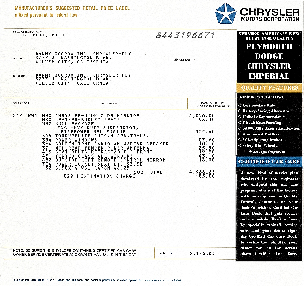 I'm recreating the window sticker for my 1964 300K. I've noticed on original ones, there is a two digit number to the left of the total at the bottom. It doesn't correlate to anything on the sheet or seem to be related to dealer code or even region.