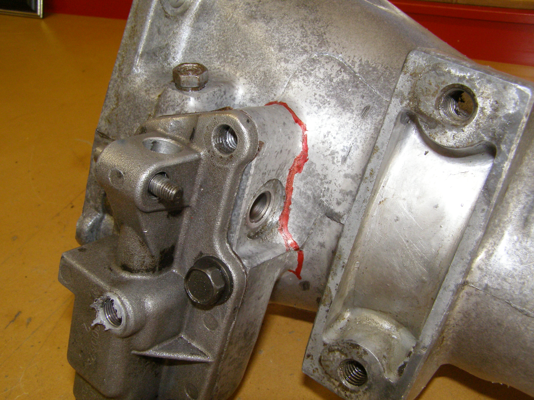 Well today was the big day to install my new driveshaft and fix a small leak in my tranny. Once the car was up in the air the job was to be nothing more than replace the leaking gasket for the park cable cover and in with the new driveshaft. That's when it was discovered that the tailshaft housing was cracked. You ever get that feeling it's not going to be a good day.