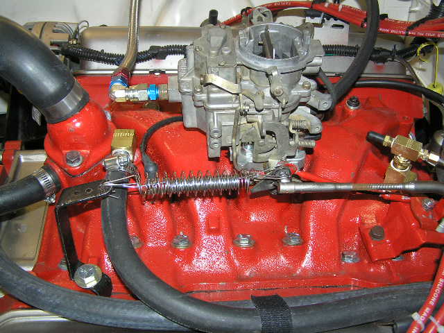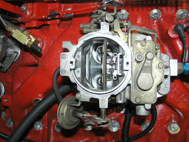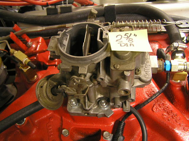 I installed a 2300 series Holley 2bbl on LeRoar as the Carter BBD was causing me grief. This is a donor that I got from Gary P. It is working pretty well on first trial run but it's missing the "harp" (not sure what to call it) that holds on an air cleaner. It looks like a lampshade harp and is spring like and snaps into the vertical slots on the carb throat with a bolt or ???? on top to attach to an ir cleaner.